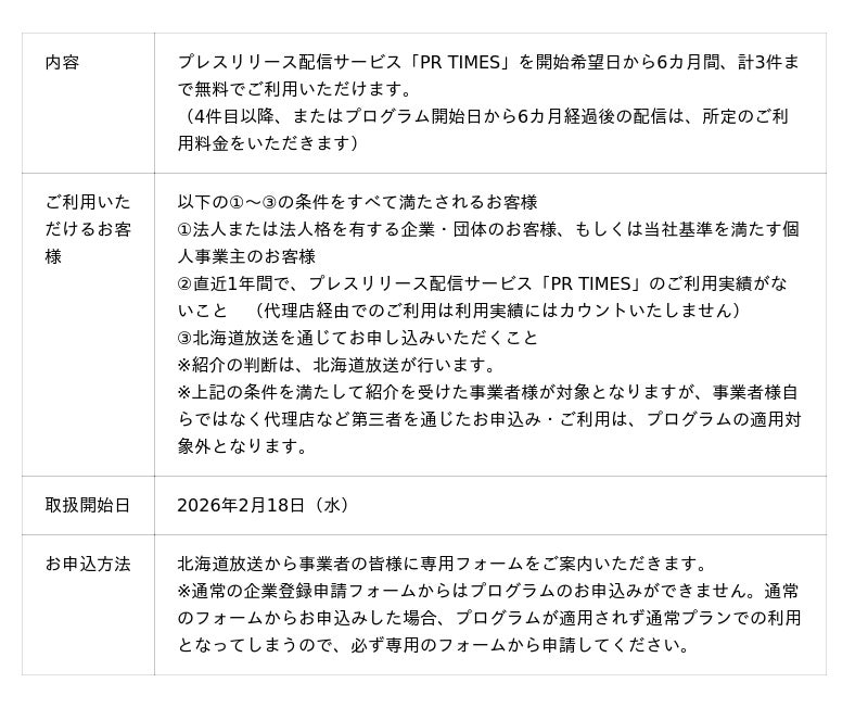 北海道放送が紹介する事業者に対し、各事業者がそれぞれ開始を希望する日から6カ月間、計3件まで無料で「PR TIMES」でプレスリリース配信いただける「HBC北海道放送プログラム」を提供します。