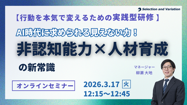 組織・人事コンサルティングファームであるセレクションアンドバリエーション株式会社(以下、当社、東京都千代田区丸の内、大阪市西区、名古屋市西区 / 代表取締役社長:平康慶浩/ URL:https://sele-vari.co.jp/ )は『【行動を本気で変えるための実践型研修】AI時代に求められる見えない力!非認知能力×人材育成の新常識』セミナーを2026年3月17日(火)12:15~12:45に開催することをお知らせいたします。