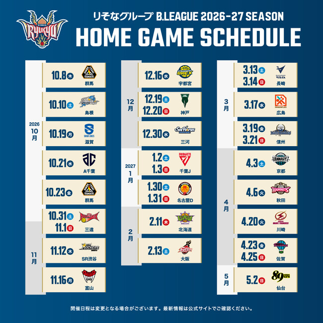 2月17日(火)にBリーグより発表がありました通り、「りそなグループ B.LEAGUE 2026-27 SEASON」全60試合の対戦カードが決定しましたのでお知らせいたします。