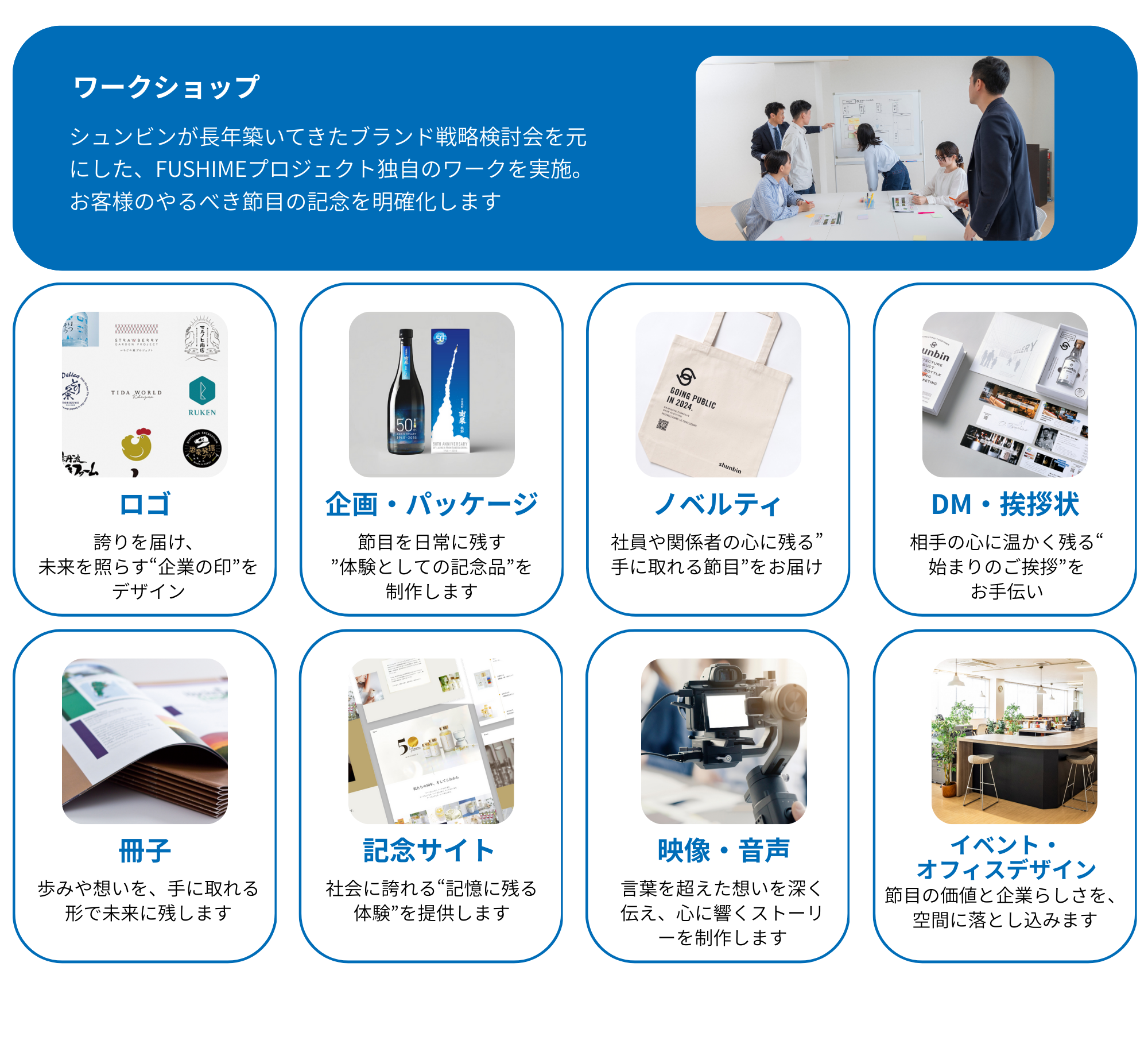 FUSHIMEプロジェクトでは、シュンビン独自の簡易ワークショップによるコンセプト策定から、記念ロゴ、冊子、記念サイトなど、企業に合った形でクリエイティブ制作。さらにイベント実行や発信に至るまで、一気通貫でサポートします。