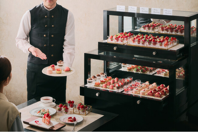 ウェルカムパーティーをお楽しみいただいた後は、心地よい自然光が差し込み緑豊かなガーデンを望む「La Jyho Terrace」にて、繊細にスライスされたいちごの断面が美しいウェルカムデセール「こだわりいちごショート」をご用意。その後は、ブランドいちご5種をはじめ、ホテルメイドの華やかないちごスイーツや、サラダ、スープ、パスタなどのセイボリーをワゴン&プラッターサービスでテーブルまでお届け。ドリンクもお席にてオーダーいただけます。通常のビュッフェスタイルとは異なり、最初から最後まで席を立つことなく、お連れ様との会話や、お好みのスイーツやセイボリーをじっくり味わう至福の時間に浸りながら、120分間の優雅なひとときをお過ごしいただけます。