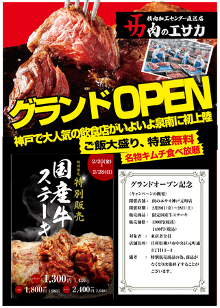 飲食店の運営・開発を行う株式会社C-HUNDRED(所在地:大阪府大阪市北区)は、「肉のエサカ泉南店」を2026年2月1日にグランドオープン致しました。そのグランドオープンを記念して、「肉のエサカ神戸元町店」は泉南店グランドオープンを記念して、普段は取り扱っていない「国産牛ステーキ」を特別価格でご提供するに至りました。