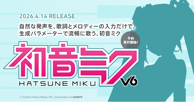 クリプトン・フューチャー・メディア株式会社(本社:北海道札幌市、代表取締役:伊藤博之、以下クリプトン)は、歌声合成ソフトウェア『初音ミク V6』の発売日を2026年4月14日(火)に決定し、本日より予約受付を開始いたしました。本製品は、ボーカルエディター「VOCALOID6 Editor」を同梱した〈スターターパック〉と、すでにエディターをお持ちの方に向けた〈ボイスバンク〉の2形態で展開。いずれの形態も歌唱パート以外の音楽制作に必要なソフトウェアや音源を同梱しているため、購入したすぐその日から本格的な音楽制作を始めることが可能です。