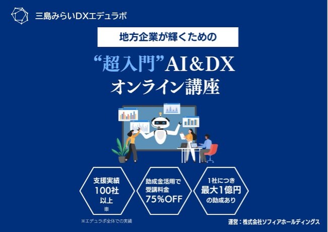 株式会社ソフィアホールディングスは、Innovation Hub株式会社(東京都港区)と連携し、DX(デジタルトランスフォーメーション)およびAI研修サービス「三島みらいDXエデュラボ」を開始いたします。まずは自社グループ企業向けに研修を提供し、その成果を基に、より広く地域企業や全国企業に向けてサービスを拡大していく予定です。