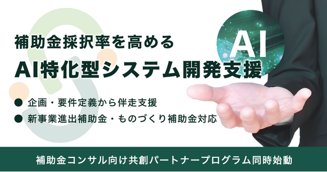 補助金採択率を高める「AI特化型システム開発支援」を開始。企画・要件定義からの伴走支援で、新事業進出補助金・ものづくりを加速。 ~補助金コンサルタント向け「共創パートナープログラム」も同時発表~