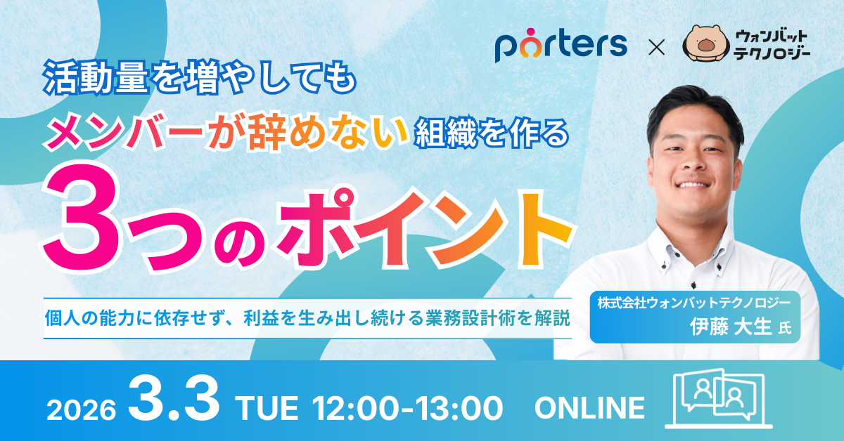 人材ビジネス向けマッチングシステムを提供するポーターズ株式会社(東京証券取引所グロース.証券コード5126、東京都港区、代表 西森 康二)は、株式会社ウォンバットテクノロジーと共同で「活動量を増やしてもメンバーが辞めない組織を作る3つのポイント ~個人の能力に依存せず、利益を生み出し続ける業務設計術を解説~」と題した無料セミナーを2026年3月3日(火)12:00~オンラインで開催いたします。