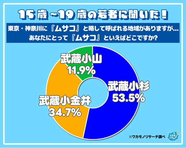 今回の調査の結果、53.5%の若者が「武蔵小杉」と回答。半数以上の若者が「ムサコ=武蔵小杉」と思っていることが分かりました。