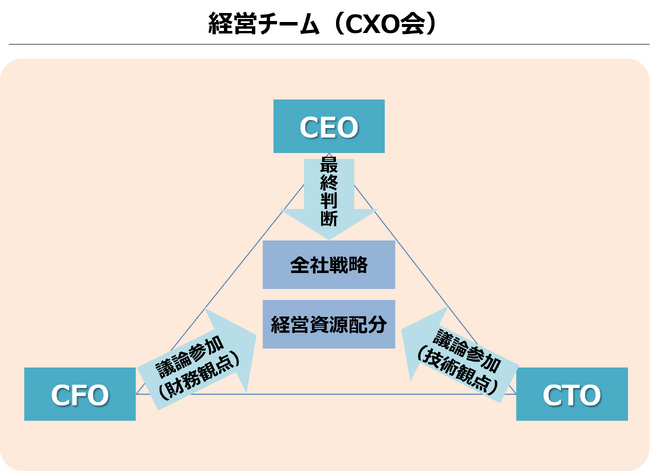 経営の重要課題に対する迅速な意思決定の実現を最優先に、CEO、CFO、CTOの3ポストに絞り込んだCXO会で高度な経営課題に対峙します。CFOおよびCTOは専任とし、CEOとともに三位一体となって経営を担います。
