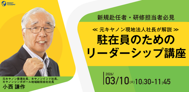 グローバル人材育成・研修業を手掛けるインサイトアカデミー株式会社(本社:東京都港区新橋、代表:金 珍燮)は、無料webセミナー「新規赴任者・研修担当者必見 ≪元キヤノン現地法人社長が解説≫「駐在員のためのリーダーシップ講座」」を2026年3月10日(火)10:30より開催します。