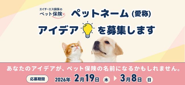 エイチ・エス損害保険株式会社(本社:東京都中央区、代表取締役社長:堤 信博、以下「当社」)は、発売から2年が経過した当社ペット保険を、より多くの方に身近に感じていただくことを目的に、ペット保険において使用する「ペットネーム(愛称)」のアイデア募集を、2026年2月19日(木)より開始いたします。