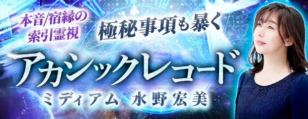 アカシックレコード|運命を刻む"宇宙の全記録"へ直接アクセスし過去/現在/未来を徹底解読。1万人超の鑑定実績を誇り、開く講座は即満員のミディアム「水野宏美」が、研鑽された索引霊視であなたに開示される真実のすべてを明確に伝達。鳥肌級の的中力をご体感ください。