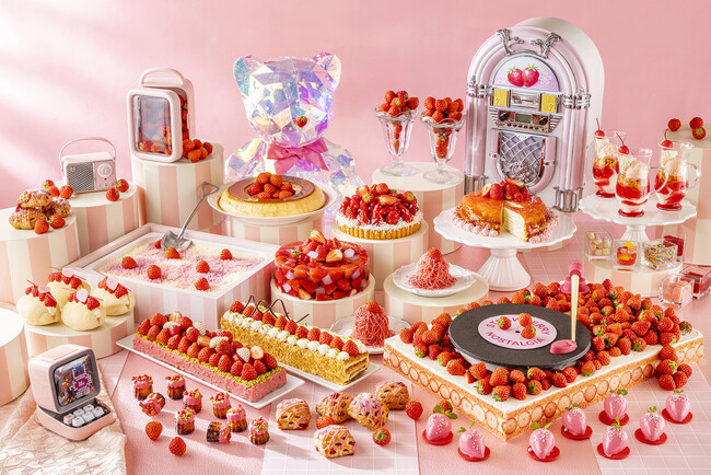 春らしいピンクを基調としたレトロポップな空間には、フォトジェニックなスイーツ全16種類が並びます。なかでも目を引くのは、いちごを贅沢に使用したストロベリーフレジェで表現した「ストロベリーミュージック」。ノイズ混じりのレコードミュージックが聞こえてきそうな、ノスタルジックな雰囲気が特徴です。また、1990年代にブームとなったナタデココを添え、ローズが香る「ほぼ、いちごDEココ」や、濃厚なカスタードとほろ苦いカラメルが懐かしさを呼び起こす「あの頃のプリン」など、記憶をくすぐるスイーツがビュッフェ台を彩ります。