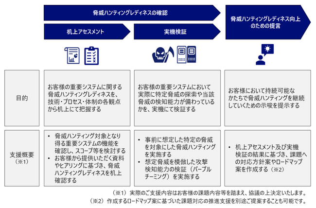 本サービスでは、机上アセスメント及び実機検証を通じて、脅威ハンティングレディネスの構築を支援します。まず、技術・プロセス・体制の各観点から、脅威ハンティングを実施するための準備状況(レディネス)を机上で確認します。その後、お客様の実機で特定の脅威を想定した脅威ハンティングや、想定脅威を模倣した攻撃に対する検知能力の検証(パープルチーミング)を実施します。これらの実施結果を踏まえ、脅威ハンティングレディネスを向上させるための提言を作成し報告します。