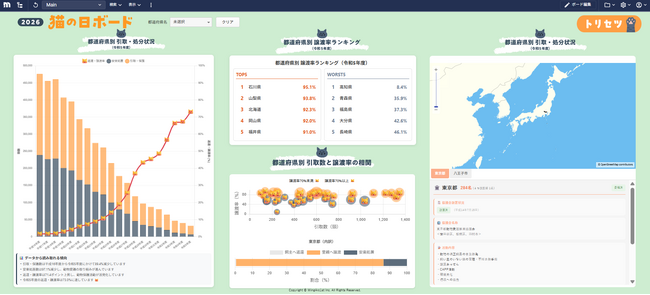 ウイングアーク1st株式会社(本社:東京都港区、代表取締役 社長執行役員 CEO:田中 潤)は、2 月 22 日の「猫の日」に合わせ、社内の猫好きメンバーと共に環境省が公開している保護猫活動データを可視化したダッシュボード「猫の日ボード 2026」を公開しました。