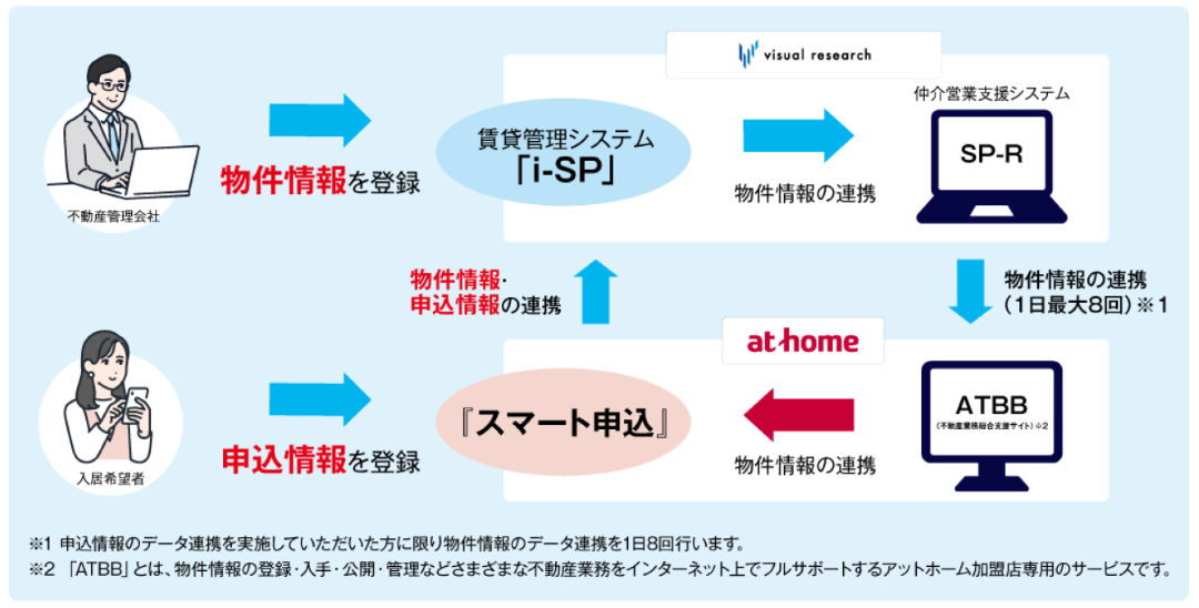 「i-SP」は、ビジュアルリサーチが開発・販売している賃貸管理業務支援システムです。取扱い物件が10,000戸以上の賃貸管理会社からの指名も多く、安心のセキュリティーを完備しています。アットホームの「スマート申込」とデータ連携しているため、「i-SP」を利用する賃貸管理会社は、「スマート申込」を導入することで、入居申込業務を「i-SP」上で完結でき、手書き書類の不備確認などの業務負荷が軽減できます。