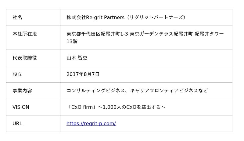 株式会社Re-grit Partners(リグリットパートナーズ)は、2017年に多様なバックグラウンドを持つプロフェッショナルによって設立された総合コンサルティングファームです。「CxO firm」をビジョンに掲げ、クライアント企業および当社から主要なビジネスリーダーを輩出することを目指しています。
