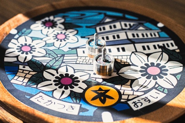 マンホールコマは、近年盛り上がりを見せている、全国の金属加工業者などが自慢の技術で作った直径2センチメートル、高さ6センチメートル以内の自作のこまを土俵上で戦わせる「全日本製造業コマ大戦」の基準に則って作られていて、コマ博士としてテレビなどに出演する東京科学大学の山崎(崎=たつさき)詩郎先生が監修した金属コマキット「ちばコマキット」をベースに企画。重さの異なる真ちゅう、アルミニウム、ステンレスの3種の金属でできたドーナッツ状の部品の並びを決めて、そこに先の尖った軸か丸い軸のどちらかを通すことで、回転の安定性や持続性が異なるこまが完成するというもの。金属部品の配置によりこまの重心位置が変わるため、こまで遊ぶ子どもたちは金属部品と軸の組み合わせを考えながら「どの組み合わせが最も回りやすいか」を体験的に学ぶことができます。こまの表面には摂津峡・高槻城・安満遺跡公園をイメージした市内のデザインマンホール蓋に加え、令和6年度から高槻市で開始した民間事業者によるマンホール広告のデザインを施し、こまを回す土俵にもマンホール蓋のデザインを採用。土俵の下に敷くプレイマットにはマンホールの下に繋がっている下水道の仕組みや下水道を守る職員の働く姿を描き、遊び方を記載したルールブックにも下水道などの豆知識などを掲載するなど、「こま遊び」と「マンホール」が見事に融合しています。
