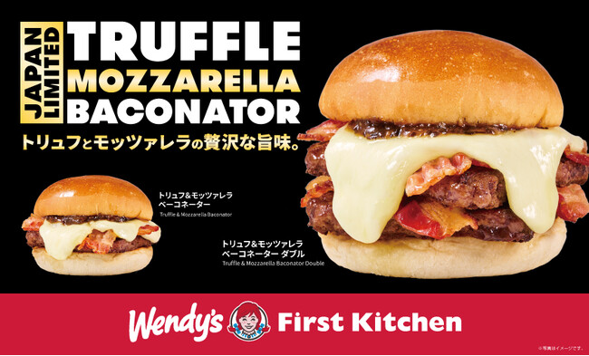 ウェンディーズ・ジャパン株式会社及び、ファーストキッチン株式会社 (所在地:東京都新宿区、代表取締役:紫関修) では、2月26日(木)から、ウェンディーズ・ファーストキッチン新宿南口店など24店舗・期間限定で「トリュフ&モッツァレラベーコネーター」など2種の商品を販売します。新商品は、アメリカ本国の定番メニューで日本でも大人気の「ベーコネーターUSA」をベースに、刻んだ黒トリュフソースと白トリュフオイルを使用し、高級感のあるバーガーに仕立てました。新商品は日本でしか味わえないオリジナル商品です。ウェンディーズのビーフ100%パティやカリカリのベーコンと、旨味あふれるとろ~りモッツァレラチーズとの調和をぜひお楽しみください。