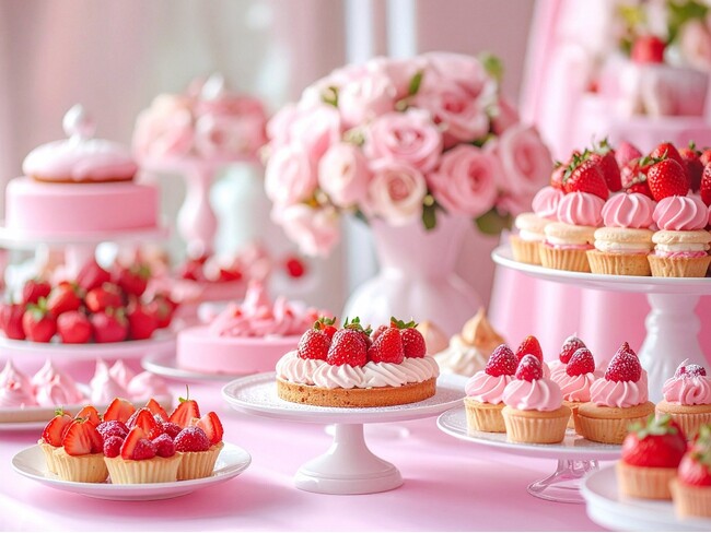 スイーツコーナーでは、「いちごのショートケーキ」や「いちごのシュークリーム」、手作りコーナーでは「いちごタルト」「いちごクレープ」などいちごスイーツが盛りだくさん!