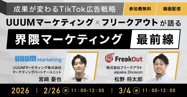 UUUMマーケティング株式会社(本社:東京都港区、代表取締役 社長執行役員:鈴木 司、以下「UUUMマーケティング」)は2月26日(木)および3月4日(水)の2日程にて、2月3日に開催し大きな反響を呼んだウェビナー「~成果が変わるTikTok広告戦略~UUUMマーケティング × フリークアウトが語る「界隈マーケティング」最前線」を、アーカイブ形式で再配信します。両日とも配信内容は同一となりますので、ご都合の良い日程にてぜひご参加ください。