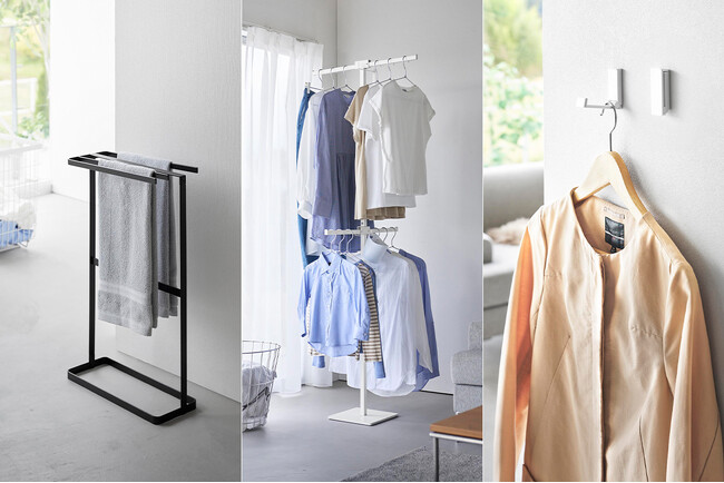 【山崎実業 新商品のお知らせ】 コンパクトに折りたためる室内用の物干しスタンドや、タオルを横からスッと楽に掛けられるスリムなタオルハンガーなど、新商品が発売になりました。