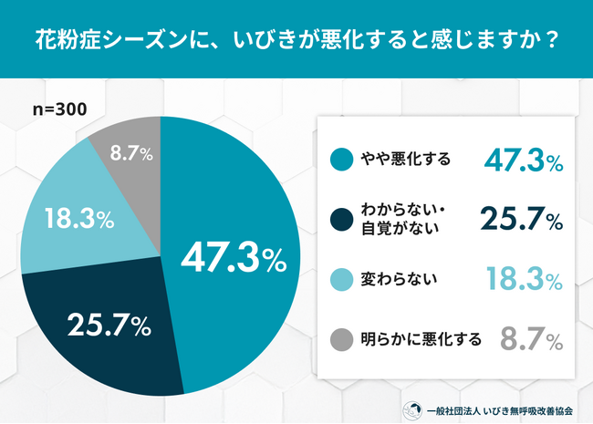 Q1:花粉症シーズンに、いびきが悪化すると感じますか?[画像1: https://prcdn.freetls.fastly.net/release_image/23848/78/23848-78-5923056441b02472d769470092c9fb1e-1074x767.png?width=536&quality=85%2C75&format=jpeg&auto=webp&fit=bounds&bg-color=fff ]