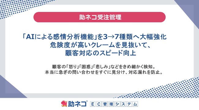 株式会社アクアリーフ(本社:神奈川県平塚市、代表取締役 長谷川 智史)が提供するネットショップ向け業務管理システム「助ネコ(R)EC管理システム(以下、助ネコ)」は、2026年2月18日より、問い合わせメールから顧客の感情を判定する、「AIによる感情分析機能」のアップデートを行いました。