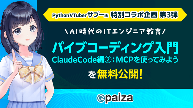 Python VTuberサプー氏×paizaコラボ第3弾「バイブコーディング入門 Claude Code編2:MCPをつかってみよう」を公開!