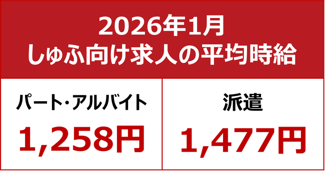 【2026年1月しゅふ求人の平均時給】パート・アルバイト:『1,258円』、派遣:『1,431円』/「フード・飲食」時給5ヶ月連続過去最高を更新!