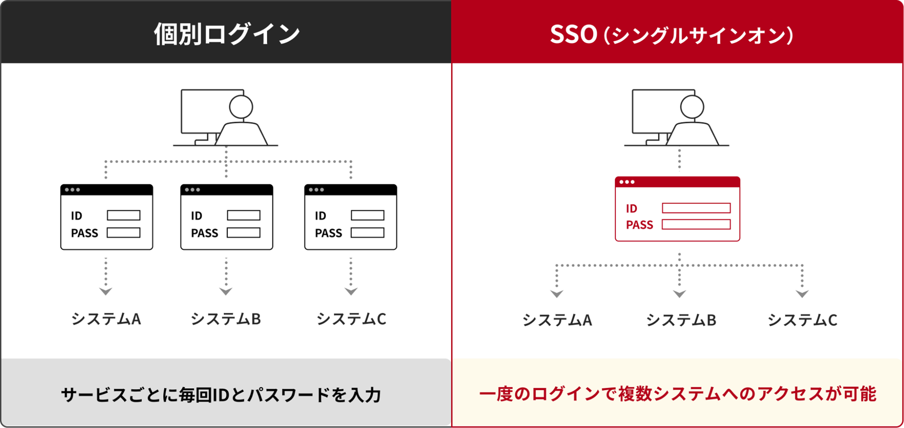 また、システムを管理するインフラ部門や情報システム部門にとっては、社員の入退社に伴うアカウント整備の手間を削減することや、ID・パスワード管理を統合し、セキュリティを強化することにもつながります。