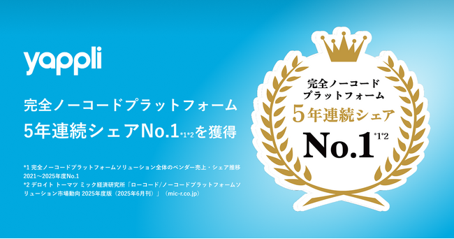 デジタルエクスペリエンスプラットフォーム「Yappli(ヤプリ)」を提供する株式会社ヤプリ(本社:東京都港区、代表取締役:庵原保文、以下「ヤプリ」)は、デロイトトーマツミック経済研究所「ローコード/ノーコードプラットフォームソリューション市場動向 2025年度版」において、完全ノーコードプラットフォーム分野で5年連続シェアNo.1を獲得しました。