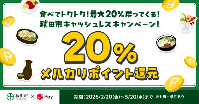 株式会社メルペイ(以下、メルペイ)は、2026年2月20日(金)より、秋田市で実施される「食べてトクトク!最大20%戻ってくる!秋田市キャッシュレスキャンペーン!」に参画することをお知らせいたします。期間中に秋田市内のキャンペーン対象加盟店で「メルペイ」のコード決済をご利用いただくと、お支払い金額の20%のメルカリポイントを還元いたします。