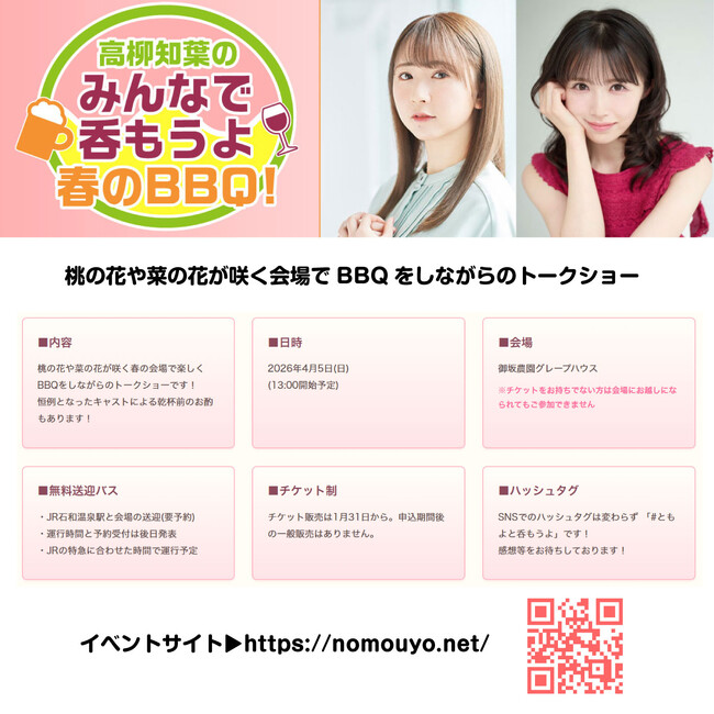 株式会社ひろめ堂(本社:山梨県甲府市)は、声優・高柳知葉をメインキャストとするイベントシリーズ「高柳知葉のみんなで呑もうよ」の第4回となる「高柳知葉のみんなで呑もうよ 第4回 春のバーベキュー!」を、2026年4月5日(日)に開催いたします。
