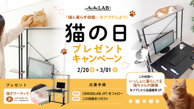 弊社趣味グッズブランド「BIBILAB(R)(ビビラボ)」の猫と人が一緒に使える家具シリーズ【ビビにゃお】は、来る2月22日の『猫の日』を記念し、計3名様に猫家具が当たるSNSプレゼントキャンペーンを開催いたします。併せて、同シリーズ待望の第二弾となる新製品の初出し情報を先行公開し、今後の展開に向けた「猫モニター」の募集を開始することをお知らせいたします。