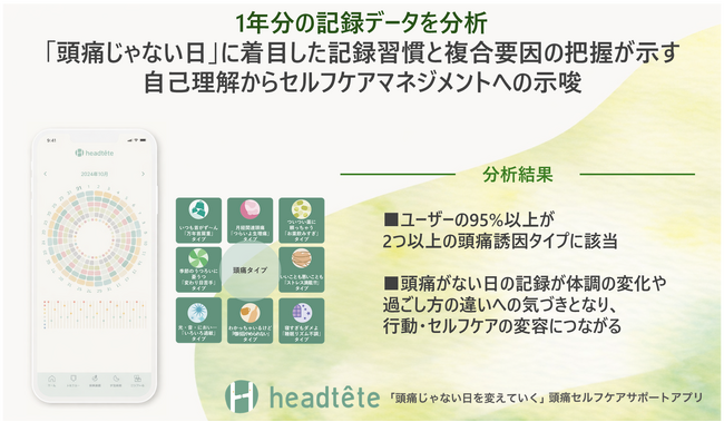 なお、本分析結果の一部は、第53回日本頭痛学会総会でも発表し、セルフケア定着支援の可能性について、一般ユーザーのみならず、医療関係者にとっても日常の記録データがもたらす示唆として関心を集めています。