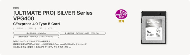 VPG400対応のCFexpress 4.0 Type AカードおよびCFexpress 4.0 Type Bカード、V90対応SDXC UHS-IIカードなど、先進の記録規格に対応した高速記録メディアを展示します。これらの製品は、像制作の高度化に対応する設計を採用し、デジタルカメラグランプリ(DGP)で金賞を受賞しています。高ビットレート動画や高速連写撮影など、プロフェッショナルの現場に求められる性能と信頼性を備えています。