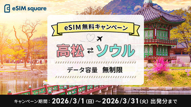 モバイル通信のクロスボーダー・ソリューションを世界規模で提供する株式会社テレコムスクエア(本社:東京都千代田区、代表取締役:吉竹 雄次、以下、「当社」)は、高松空港振興期成会(会長:香川県知事 池田豊人)および高松空港株式会社(代表取締役社長 小幡義樹)と共同で、2026年3月1日(日)~2026年3月31日(火)に高松空港を出発するソウル便往復利用者に向けてeSIMを無料配布するキャンペーンを実施いたします。