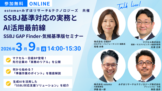 ESG情報開示支援プラットフォームを提供する株式会社estoma(本社: 東京千代田区、代表: 伊藤総一郎、以下「estoma」)は、業務提携先であるみずほリサーチ&テクノロジーズ株式会社と共同で、2027年3月期から義務化される「SSBJ(サステナビリティ基準委員会)基準」への対応をテーマにした共催セミナーを開催いたします。