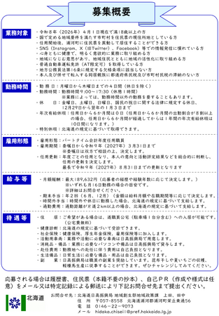 令和8年(2026年)3月16日(月)午後5時までに日高振興局地域政策課へ必要書類(履歴書、