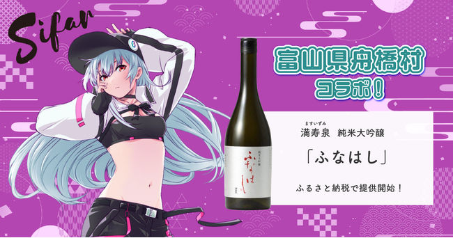 日本酒が大好きなVtuber「sifar(シファル)」と老舗の酒蔵である満寿泉がコラボをして富山県舟橋村のふるさと納税の返礼品として日本酒「ふなはし」を2月20日(金)より提供しました。返礼品は株式会社あるやうむ(本社:北海道札幌市、代表取締役:畠中博晶、以下「あるやうむ」)が提供する寄付サイトにて寄付を受け付けます。