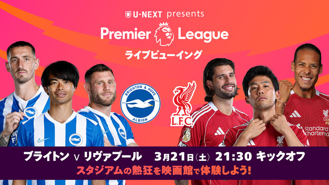 USEN&U-NEXT GROUPの株式会社U-NEXT(本社:東京都品川区、代表取締役社長:堤 天心)が運営する動画配信サービス「U-NEXT」は、2026年3月21日(土)にサッカー・プレミアリーグのライブビューイングイベントを実施いたします。今回は『ブライトン vs. リヴァプール』をTOHOシネマズとイオンシネマ、109シネマズの計9会場でライブ配信いたします。