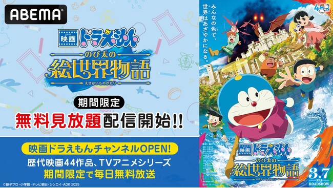 新しい未来のテレビ「ABEMA」は、『映画ドラえもん 新・のび太の海底鬼岩城』の公開を記念し、2026年2月21日(土)夜8時30分より、昨年公開されたシリーズ44作品目『映画ドラえもん のび太の絵世界物語』の期間限定無料・見放題配信を開始いたします。また合わせて映画ドラえもんチャンネルを期間限定で開設することをお知らせいたします。