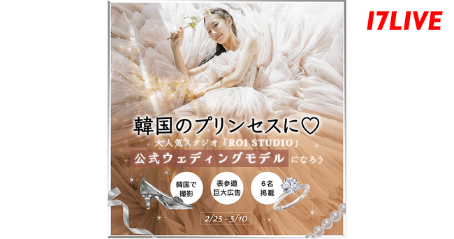 17LIVE株式会社(東京都渋谷区、代表取締役:ジャン・ホンフイ、URL:https://jp.17.live/)が運営する日本最大級のライブ配信アプリ「17LIVE(イチナナ)」は、韓国でも大人気の「ROI STUDIO」と初のコラボレーションとして、同ブランドの公式ウェディングモデル就任と巨大広告への掲載をかけたイベント『韓国のプリンセスに!大人気スタジオ「ROI STUDIO」公式ウェディングモデルになろう』を、2026年2月23日(月)より開催することが決定しましたので、お知らせいたします。