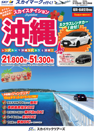 スカイパックツアーズ株式会社(本社:東京都中央区、社長:横山正巳)は、スカイマークを利用した価格固定型のパンフレット旅行商品「スカイステイション レンタカー付沖縄」【福岡・長崎空港発着】(2026年3月29日出発~2026年10月24日帰着)の販売を開始します。スカイマークだけを取り扱う専売店だからできるスペシャルプライス!早めのご予約がお得です。