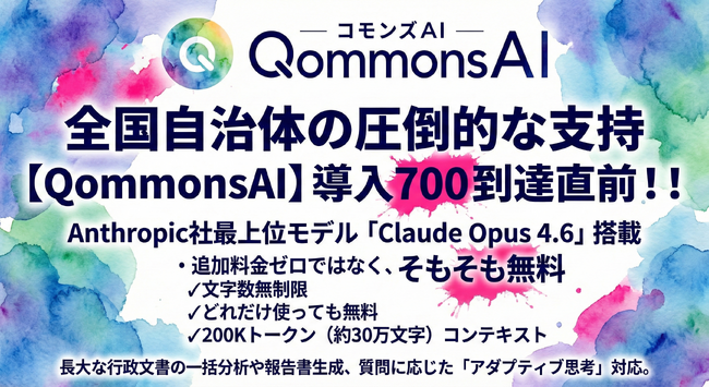 【速報】導入自治体700目前の行政向け生成AI「QommonsAI」、Anthropic最上位モデル「Claude Opus 4.6」を“追加料金ではなく無料”標準搭載で自治体行政のAXを推進