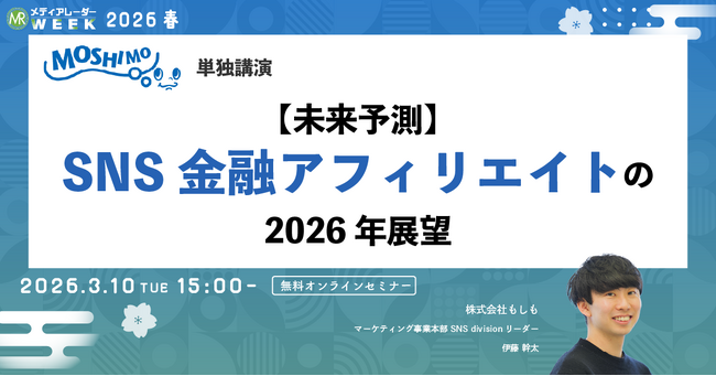 株式会社アイズ(所在地:東京都渋谷区、代表取締役社長:福島範幸、東証グロース:5242)が運営するNo.1*の広告業界のプラットフォーム「メディアレーダー」が主催するマーケティングセミナーイベント「第21回メディアレーダーWEEK 2026 春」にて、株式会社もしも様が3/10(火)に登壇します。視聴申し込みは無料です。