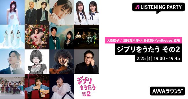 AWA株式会社(本社:東京都港区、代表取締役CEO:冨樫晃己)が運営する、サブスクリプション型(定額制)音楽ストリーミングサービス「AWA(アワ)」は、2026年2月25日(水) 19:00~19:45にて、無料で誰でも参加できるオンライン空間「ラウンジ」で、スタジオジブリ トリビュートアルバム「ジブリをうたう その2」特集のリスニングパーティーを開催いたします。