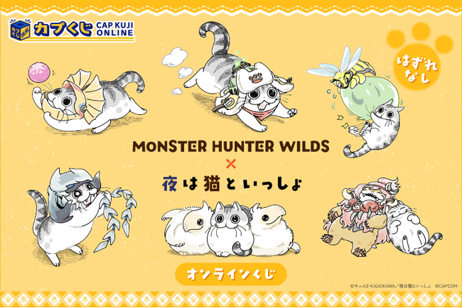 株式会社カプコンが運営するオンラインくじサービス「カプくじオンライン」(以下、「カプくじ」)にて、大人気コミックエッセイ『夜は猫といっしょ』の作者”キュルZ”先生の描き下ろしイラストを使用した、「モンスターハンターワイルズ×夜は猫といっしょ」のオリジナル商品を販売いたします。