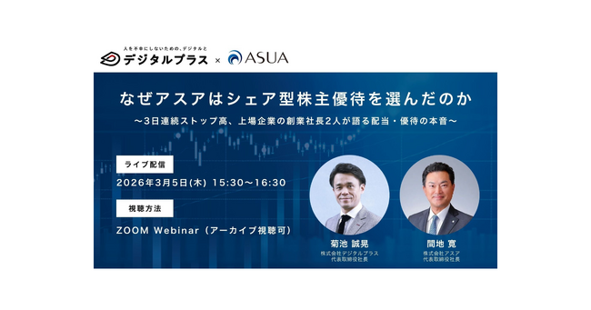 株式会社アスア(代表取締役社長:間地 寛、東証グロース・名証ネクスト:証券コード246A)において、株式会社デジタルプラス(代表取締役社長:菊池 誠晃、東証グロース市場:証券コード3691)グループが提供する「デジタルギフト(R)」を活用した、優待還元額を固定できる新たな仕組み「シェア型株主優待」が導入されました。