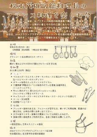 当日は、ANAクラウンプラザホテルグランコート名古屋のご協力のもと、一流のシェフによる本格的なフランス料理のコースが提供され、参加者のみなさまに心温まるひとときをお楽しみいただける内容となっております。